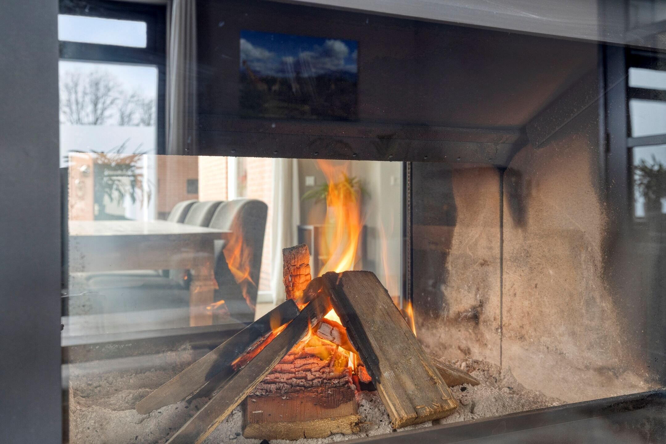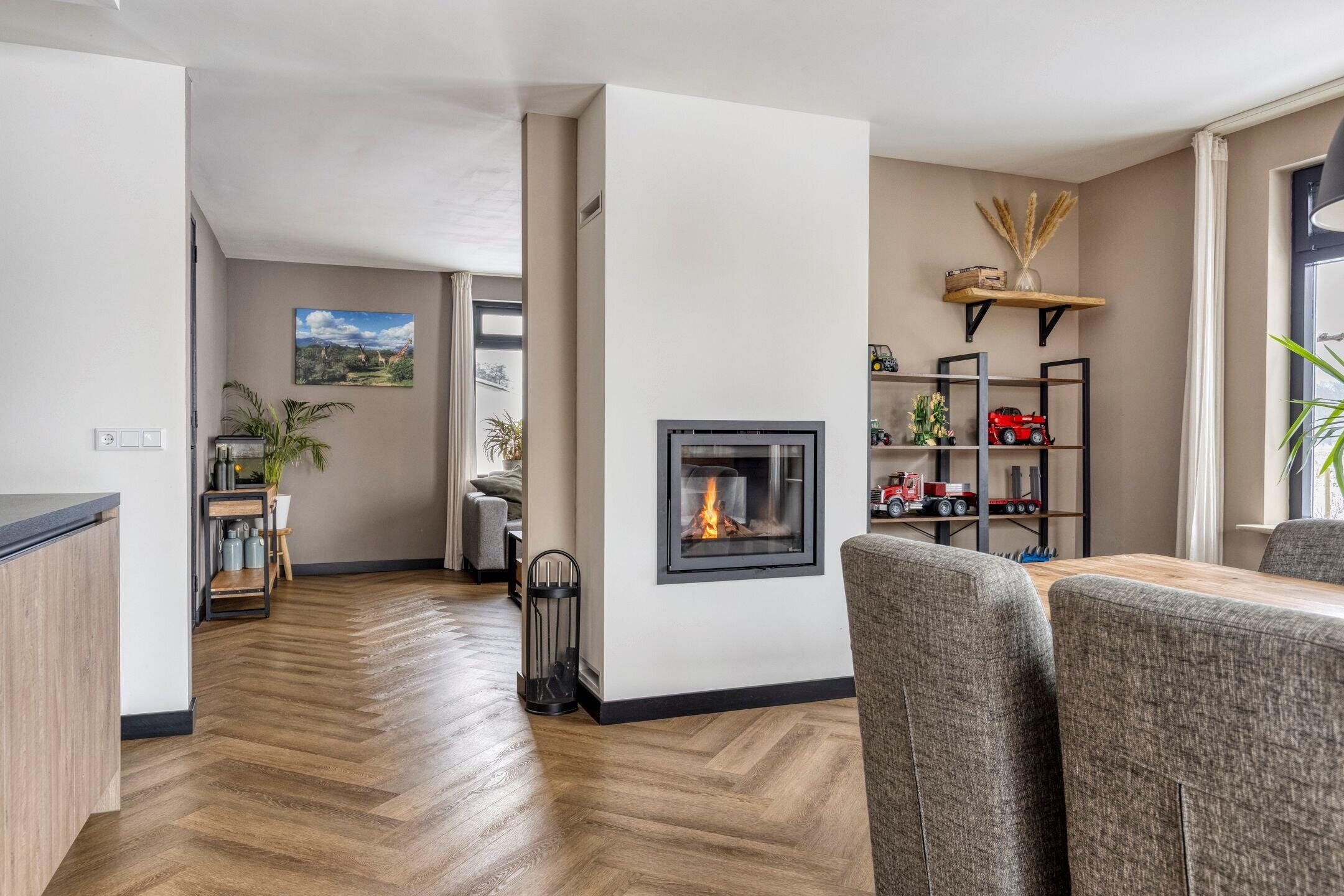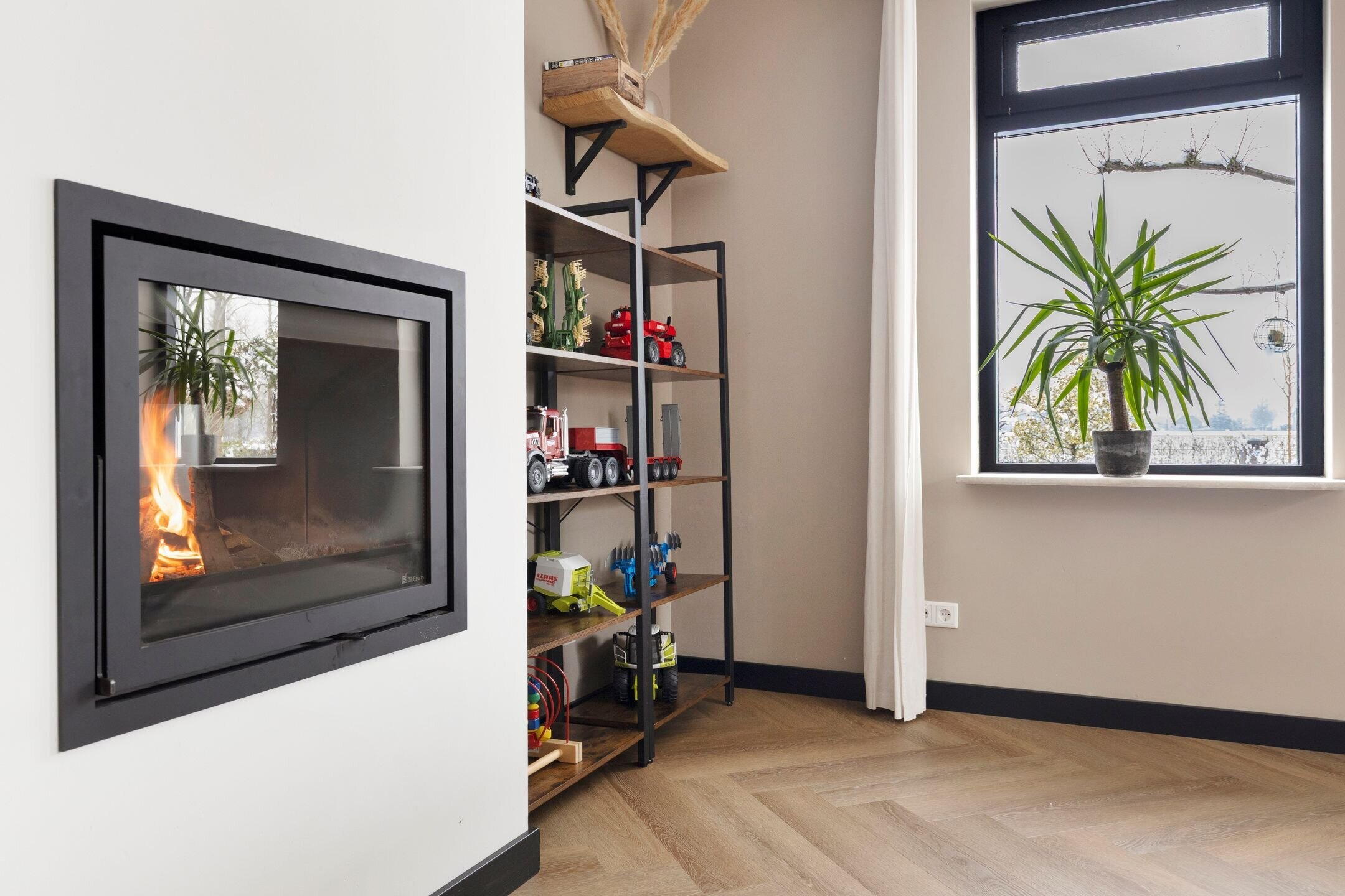 Een gezellig woonkamer die wordt gekenmerkt door veel lichtinval en een prettige sfeer. De haard met doorkijk vormt een mooi middelpunt en verbindt de leefruimtes op een natuurlijke manier. Via de schuifpui in woon/eetkeuken sta je direct in contact met het terras en de tuin. De gehele begane grond is voorzien van vloerverwarming, wat zorgt voor extra comfort.