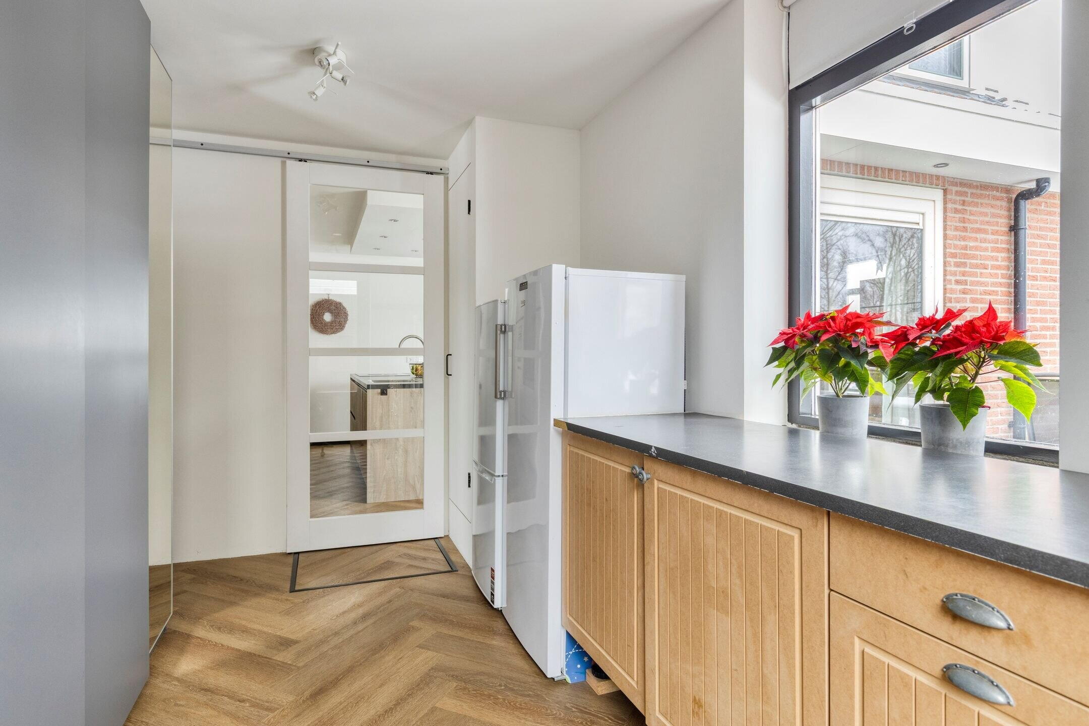 Aansluitend bevindt zich de bijkeuken met vaste kast waar de gasmeter zich bevind, witgoedaansluitingen en een extra keukenblok met water en afvoer. Praktisch en prettig in het dagelijks gebruik.