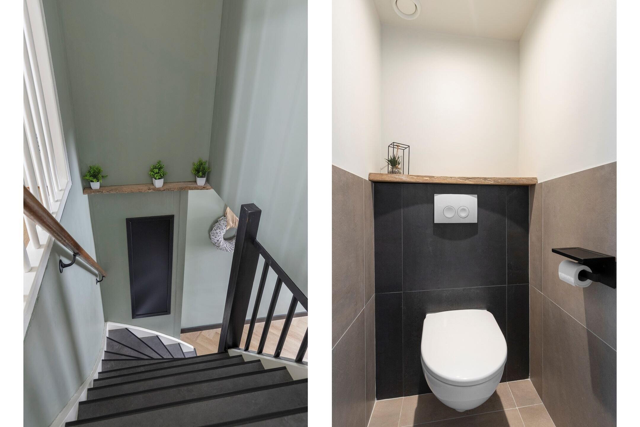 Je betreedt de woning via de hal met meterkast, kelderkast, trapopgang en een modern zwevend toilet met fontein.